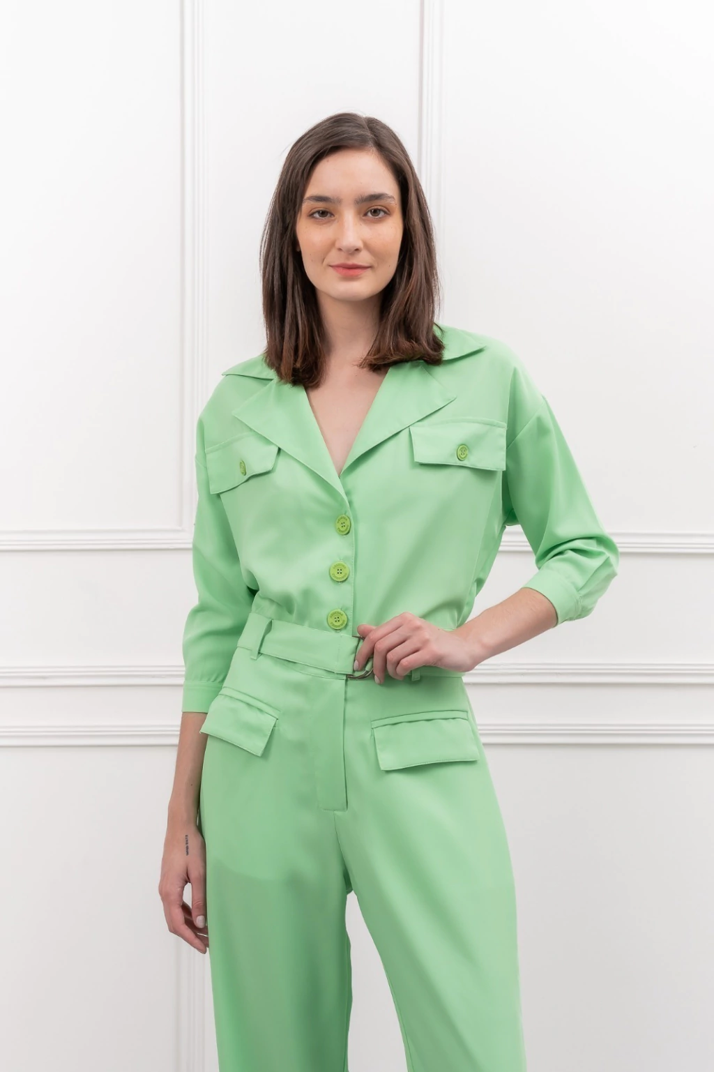 Monoprenda manga 3/4 confeccionada en Twill. Posee cuello camisero, cartera a la vista con botones de pasta al tono personalizados. Es una pieza de silueta recta, donde la cintura cuenta con presillas y cinturón desmontable con hebilla metalica que nos permite brindarle el entalle que nos haga sentir más comodas.