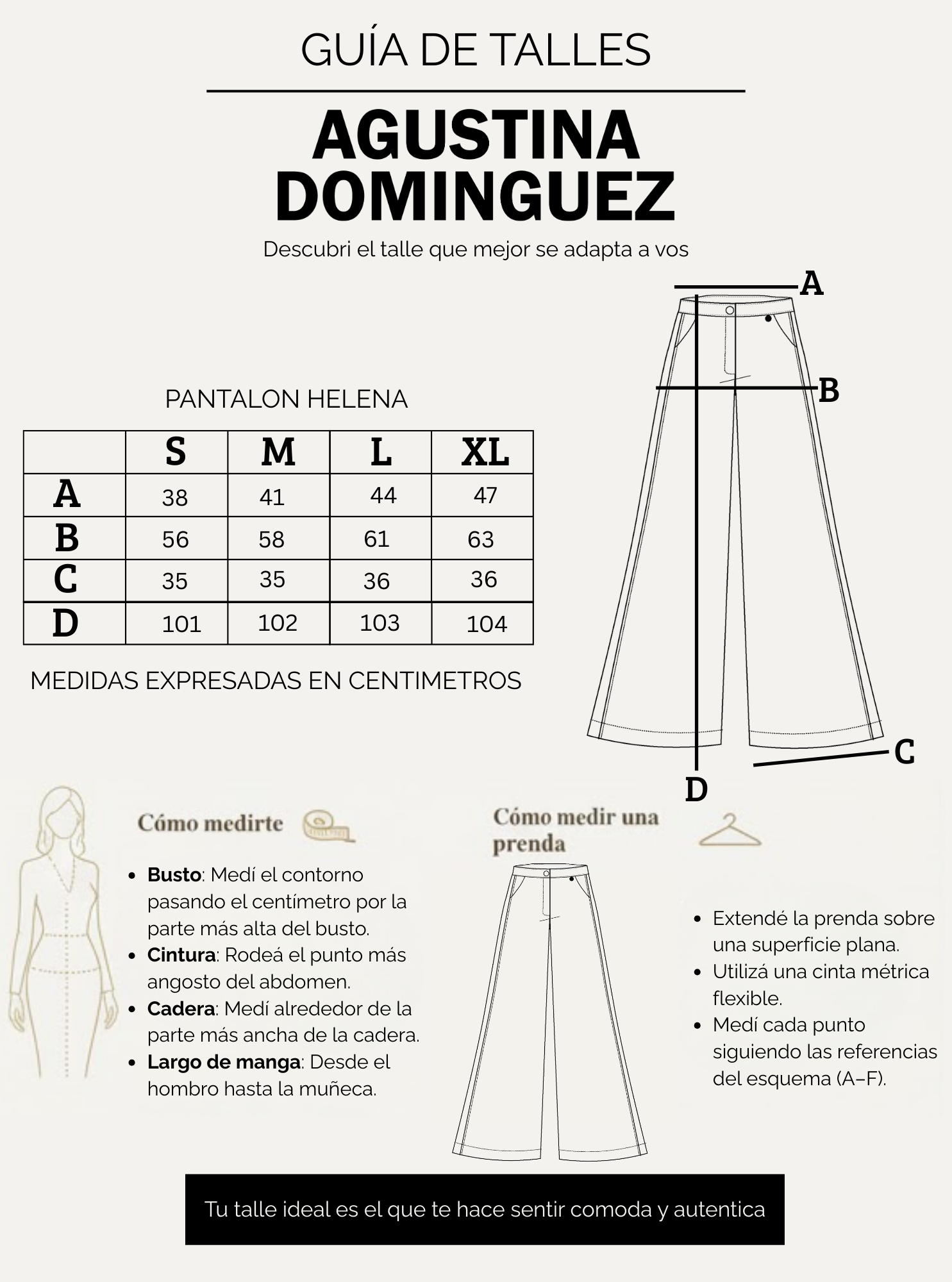 El Pantalón Helena es un wide leg de impronta sastrero–relajada, con pierna ancha y caída fluida. De tiro medio–alto, estiliza la figura y presenta una franja lateral en contraste color crema tipo galón que recorre toda la pierna, generando un efecto visual de piernas infinitas. Su cintura limpia y estructura simple aportan un look prolijo y minimal, con largo al piso ideal para usar con taco o punta fina.