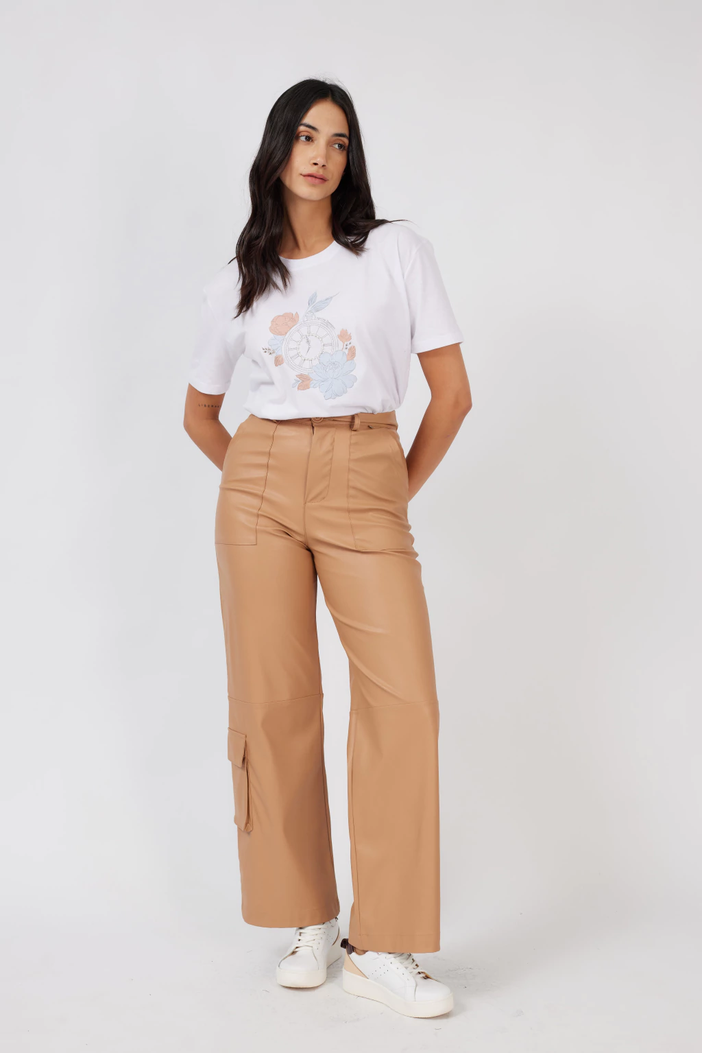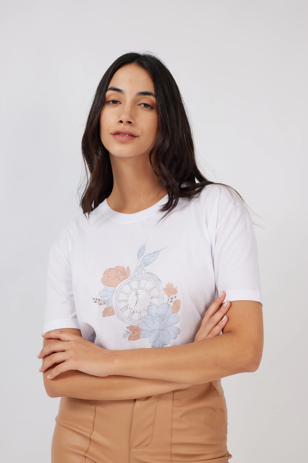 Remera manga corta confeccionada en 100% algodón, de moldería básica y con estampa propia en frente. Ésta pieza es perfecta como primera piel y para complementar tus outfits casuales.
