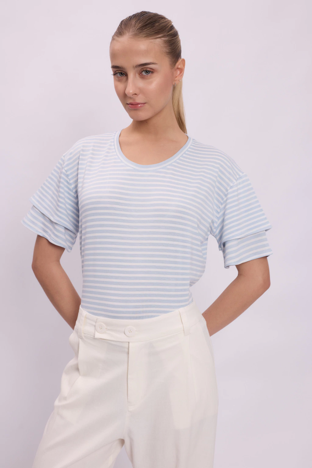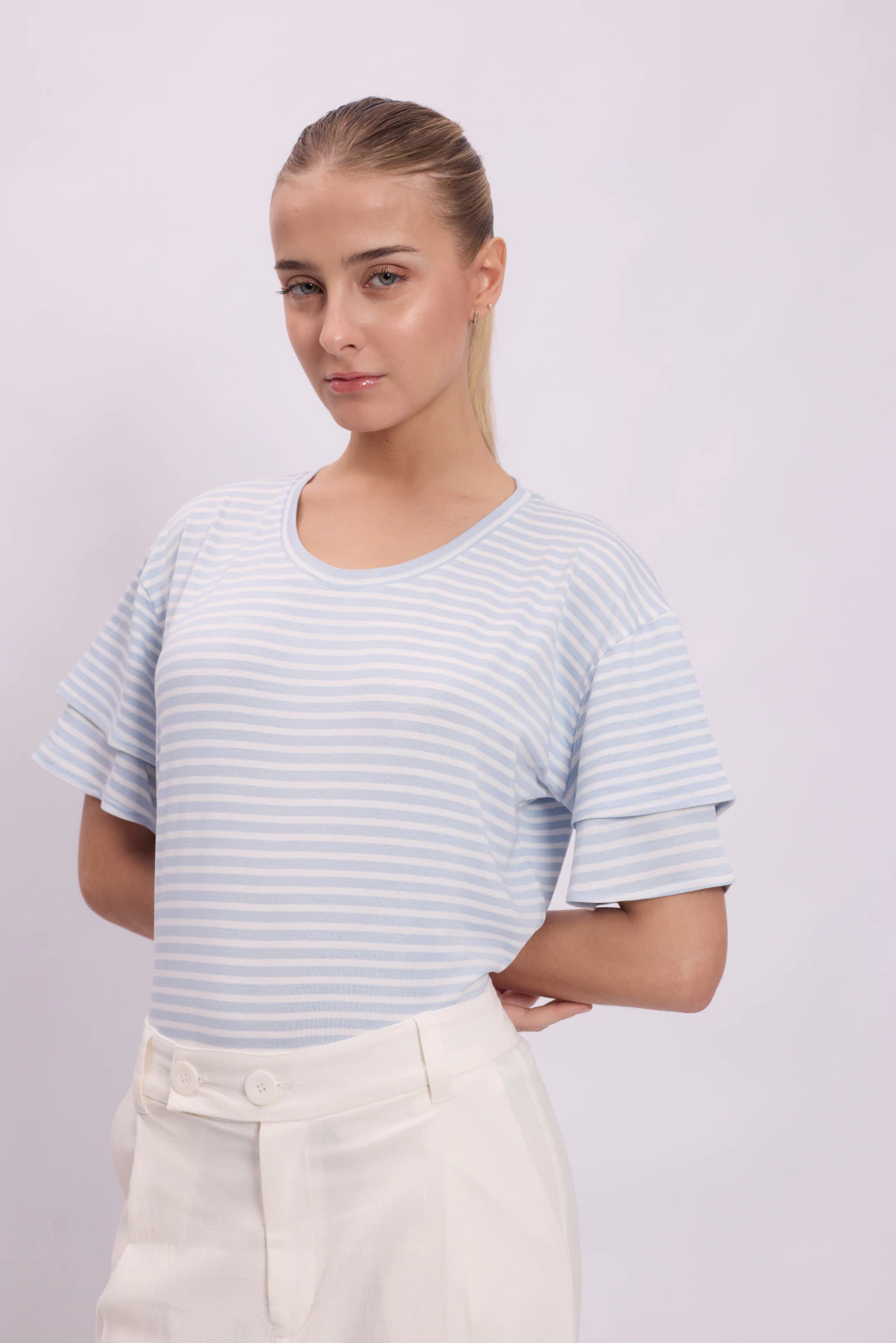 Remera de manga ancha y escote redondo, confeccionado en Viscosa con Lycra rayado. Posee volado en manga, lo que le otorga un estilismo original a la pieza. Ideal para acompañar y lucir looks casuales