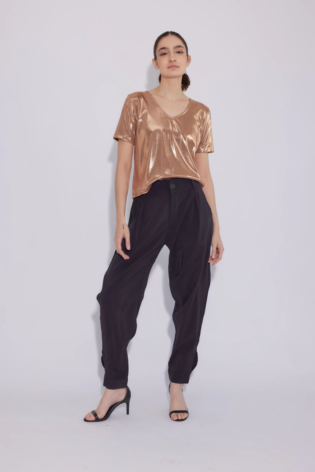 Remera de corte básico escote en V confeccionada en jersey con foil, lo que le da un sutil brillo fino y delicado.