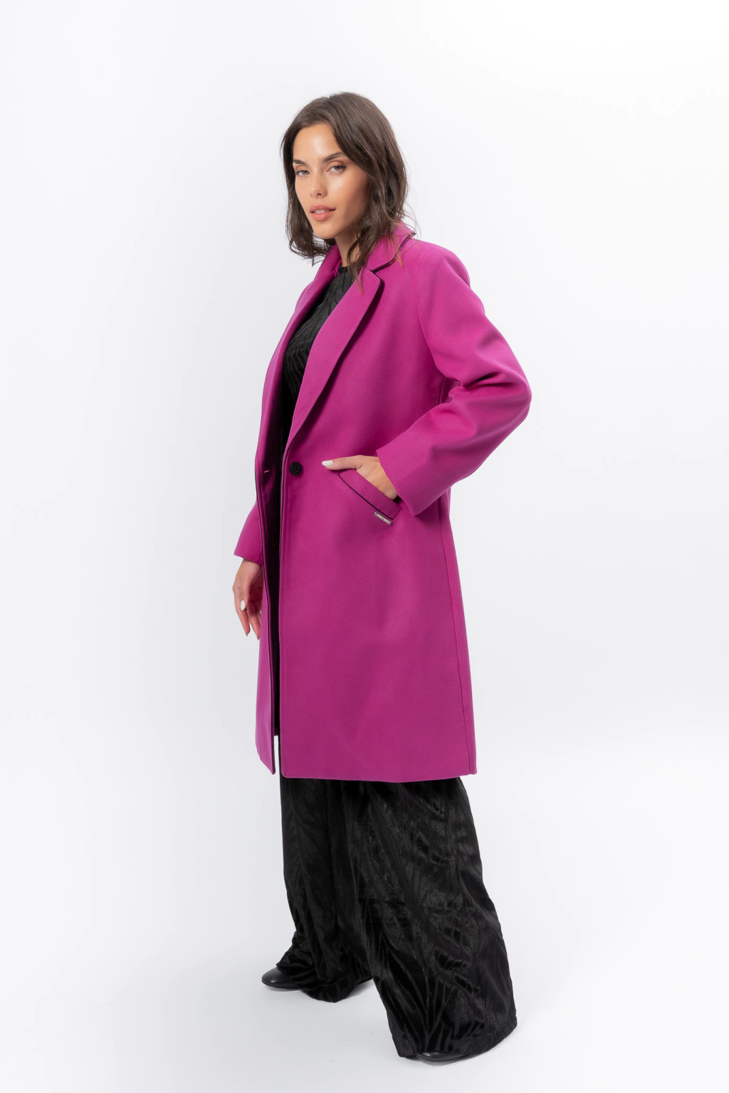 Tapado de corte entallado confeccionado en paño con detalles de envivado tanto en solapa como en bolsillos delanteros. Cuenta con forro interno y botones de pasta.